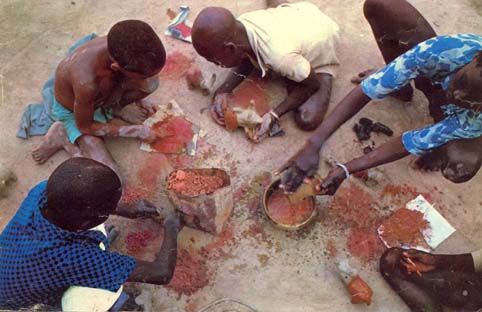 du charbon de bois, le rouge avec de la latérite, et enfin le blanc avec