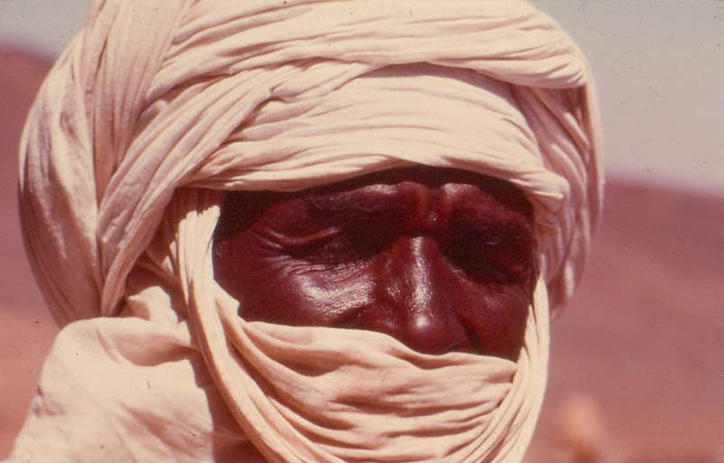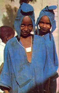 (pagnes indigo, cotonnades en bandes blanches, rouge des sandales).