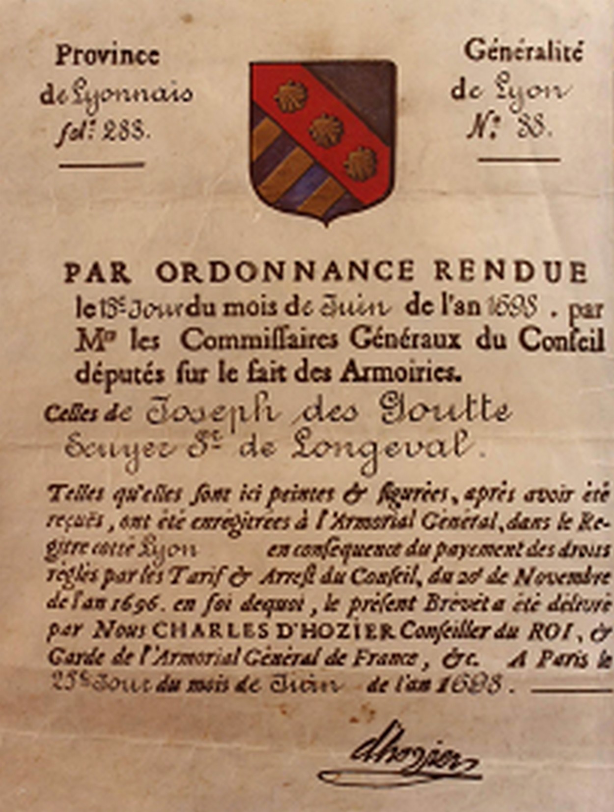 Benoît découvre également (sans doute aux archives départementales du Rhône) un certificat de noblesse délivré par d'Hozier à un seigneur Joseph des Goutte de Longeval, de Saint-Just d'Avray. La famille des Gouttes de la Salle est originaire de Montrottier (proche d'Affoux) où Étienne et Jean des Gouttes sont notaires en 1359 et 1401 (descendants de Geoffroy, seigneur de la Goutte, docteur ès droits, + avant 1364, cf. infra). Étienne est châtelain de Chamousset en 1431. Jacques des Gouttes de la Salle (+1579), notaire, acquiert en 1569 la baronnie d'Yzeron d'Antoine d'Albon, archevêque de Lyon que l'on retrouvera plus loin. Il revendique, avec succès (1549), que soit reconnue la noblesse de sa lignée (voir d'Herbigny, 1783 et Chérin 95, op. cit. et infra).